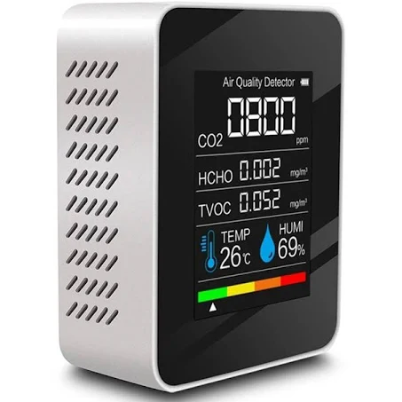 Detectorul de calitate a aerului 5-in-1 este un dispozitiv esențial pentru monitorizarea aerului din interiorul casei tale. Acesta măsoară cu precizie CO2, HCHO, TVOC, temperatura și umiditatea, oferindu-ți date clare pe un ecran color de înaltă rezoluție. Cu tehnologia avansată NDIR pentru CO2 și senzorul electrochimic pentru HCHO și TVOC, obții măsurători rapide și precise. Este ușor de utilizat: îl pornești sau oprești ținând apăsat butonul "Power" și poți schimba unitatea de temperatură între Celsius și Fahrenheit printr-o simplă apăsare. Cu o baterie reîncărcabilă de 1200 mAh, detectorul funcționează până la 8 ore, fiind ideal pentru utilizarea în dormitoare, bucătării sau chiar în mașină. Asigură-te că îl calibrezi dacă observi abateri ale datelor CO2 după transport sau o perioadă de utilizare.